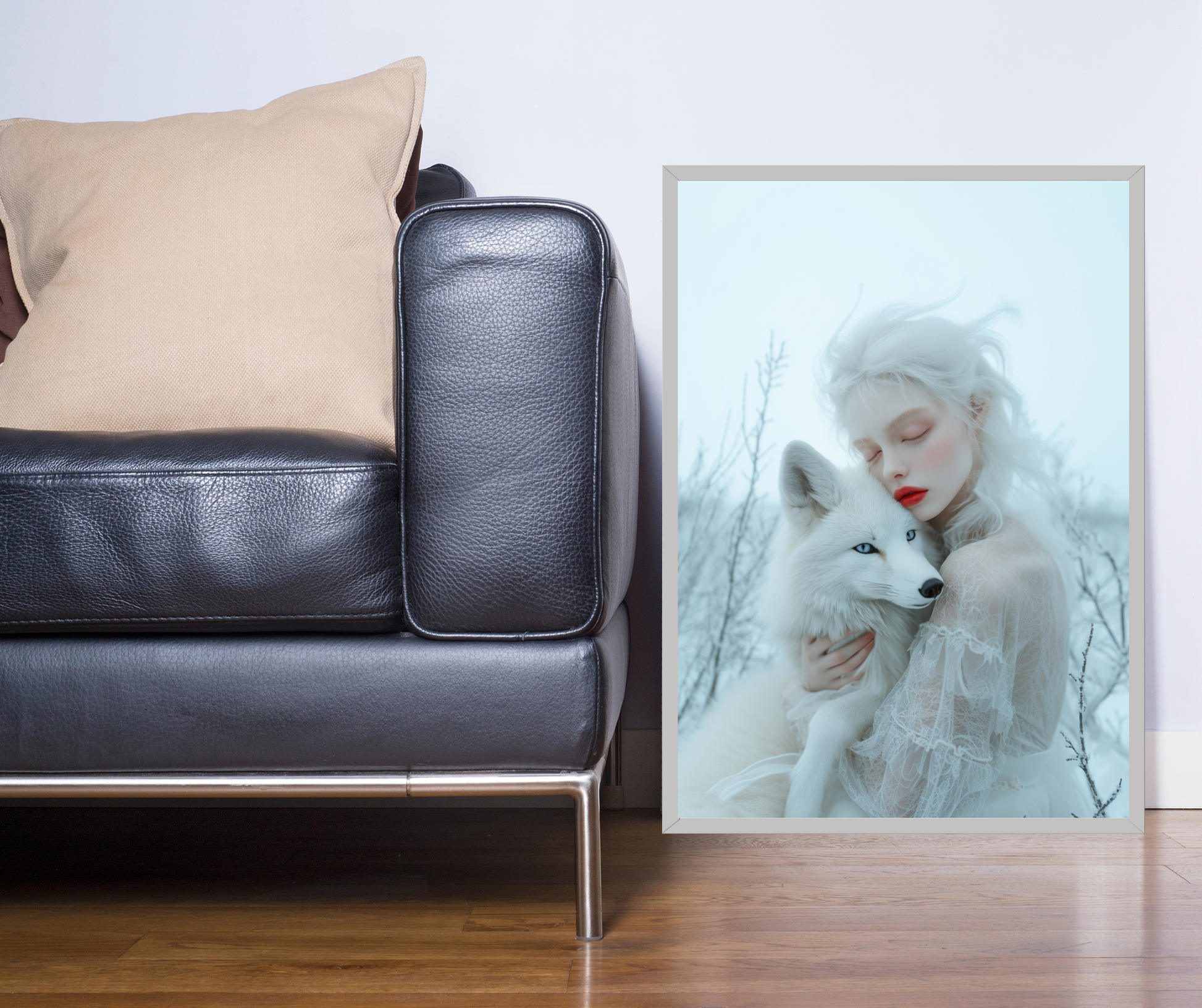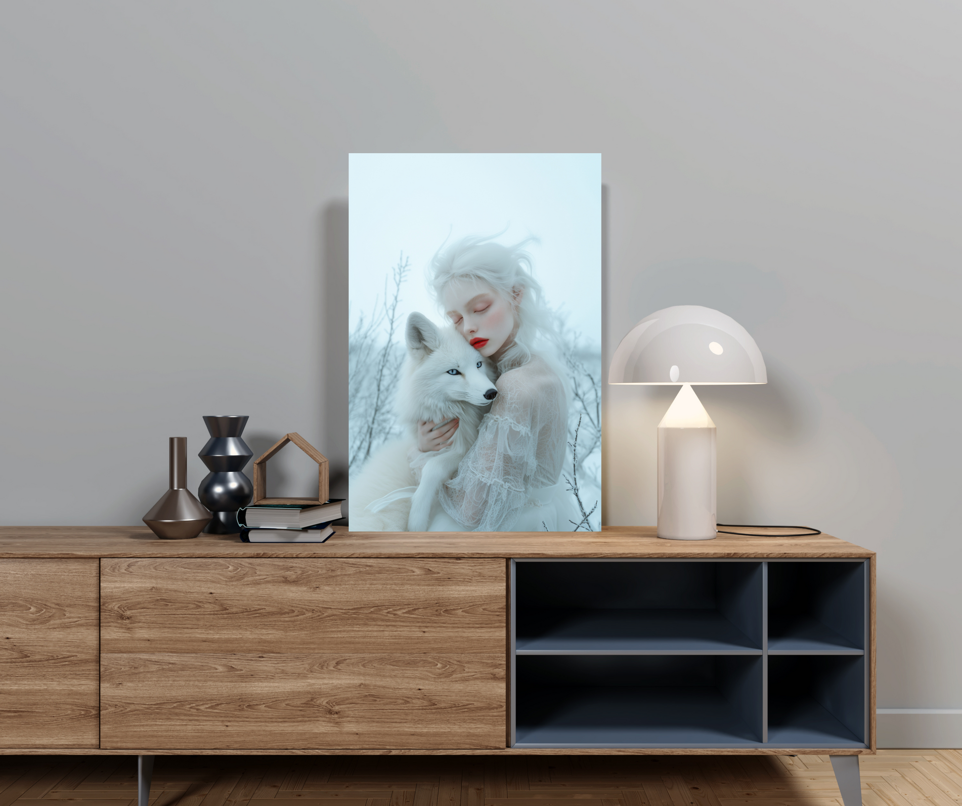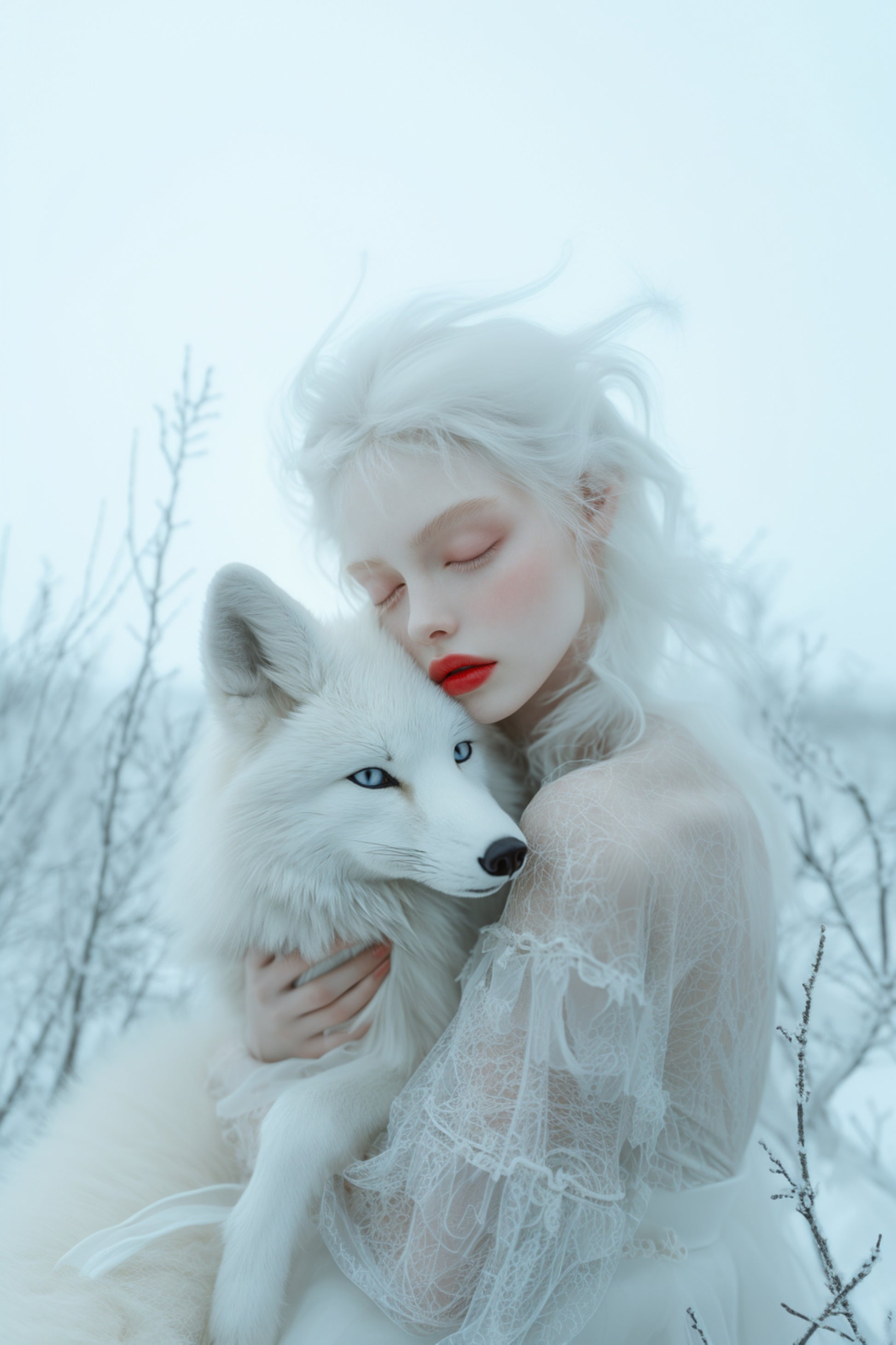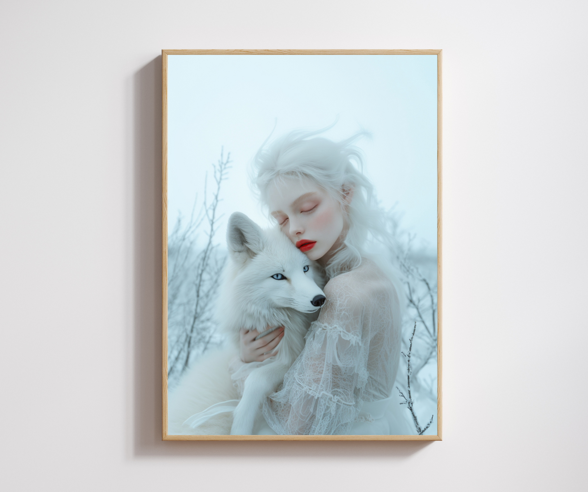 Lámina que muestra a una joven de pelo blanco abrazando a un zorro blanco en un paisaje invernal. Una escena de calma y cercanía que transmite la conexión entre humano y naturaleza.