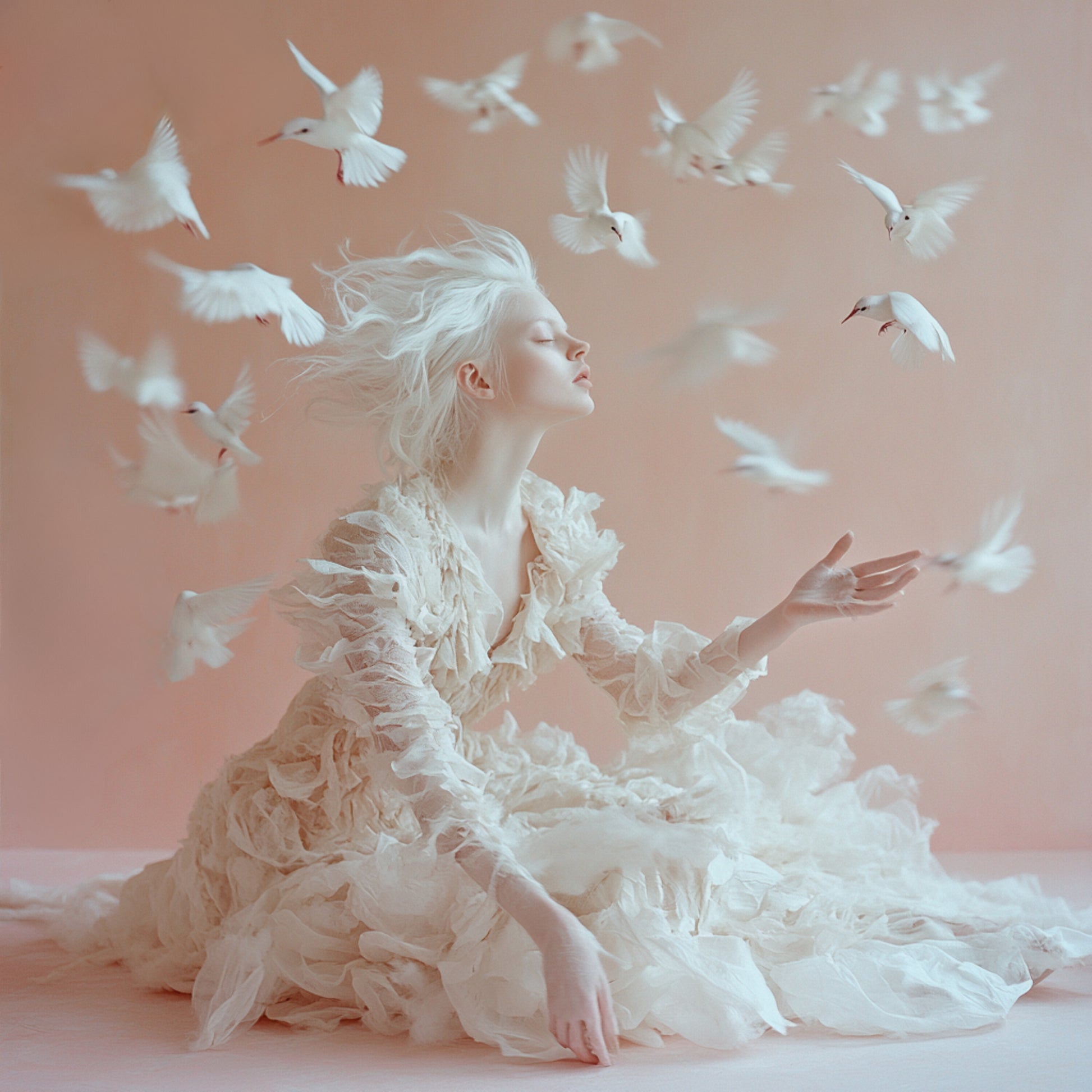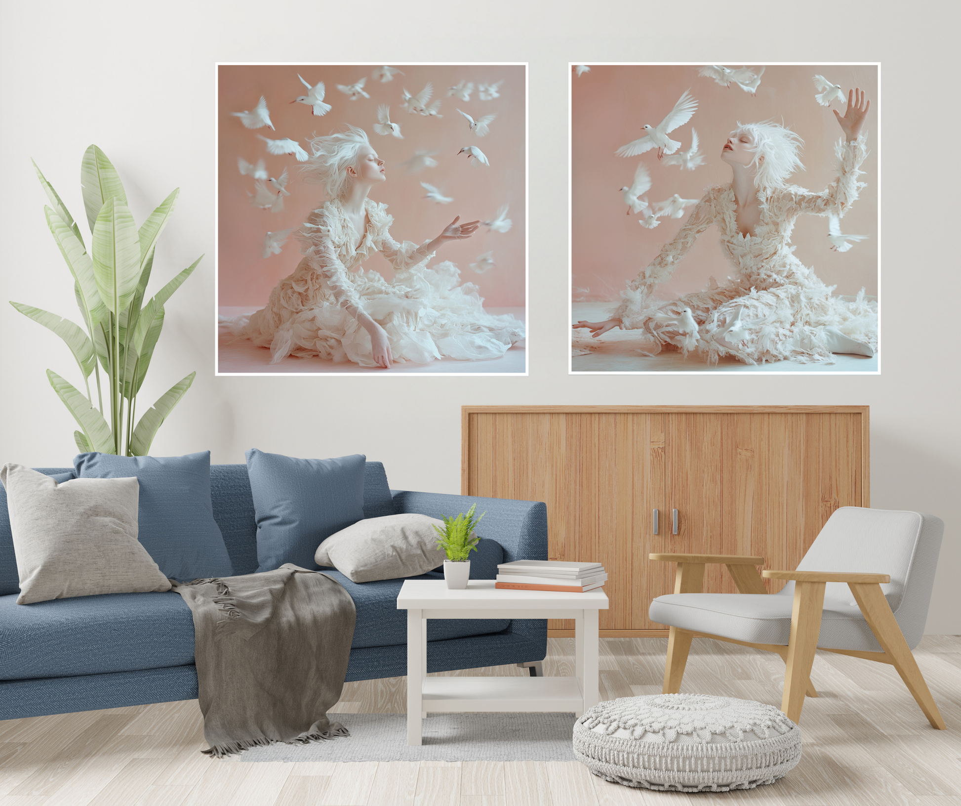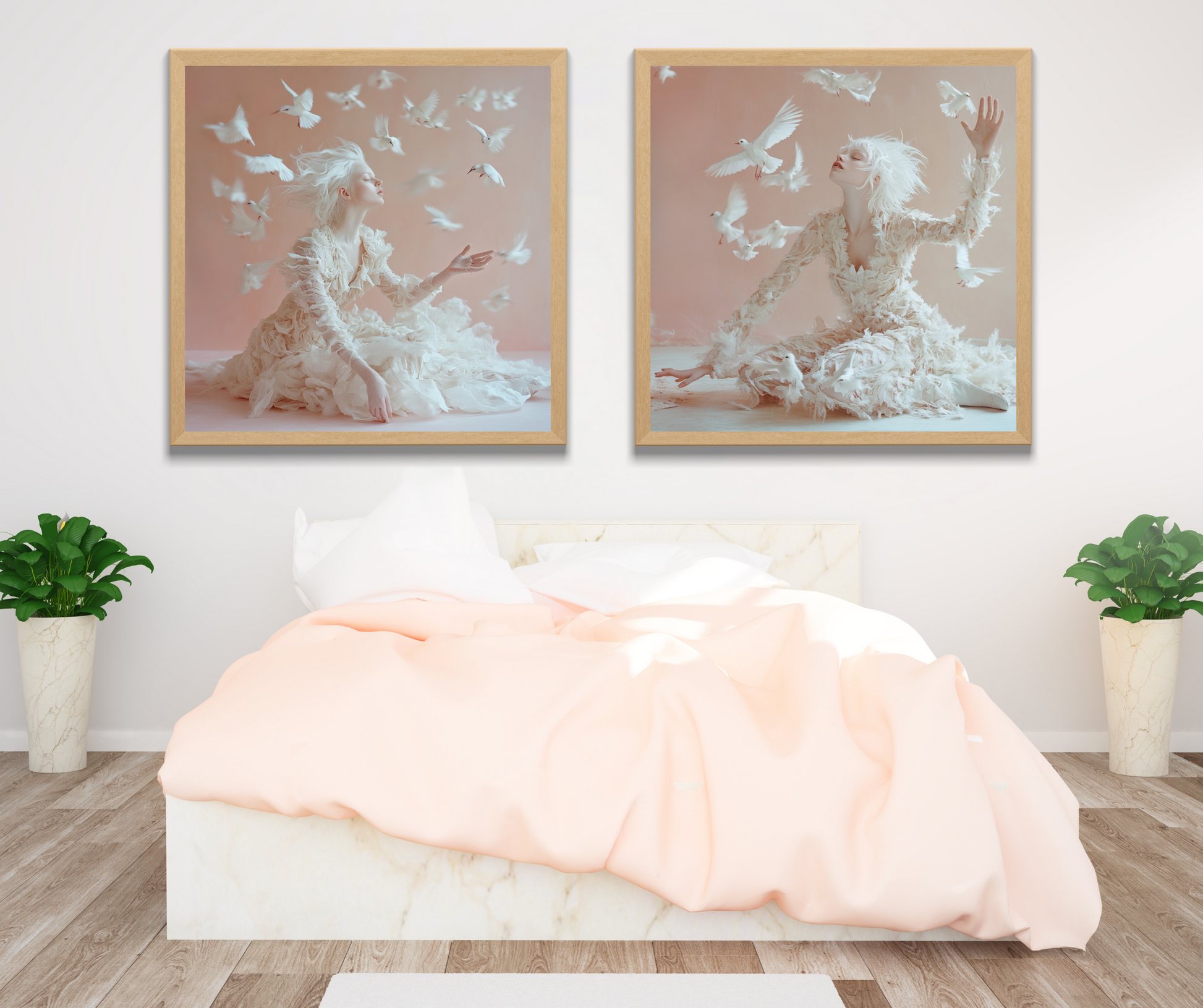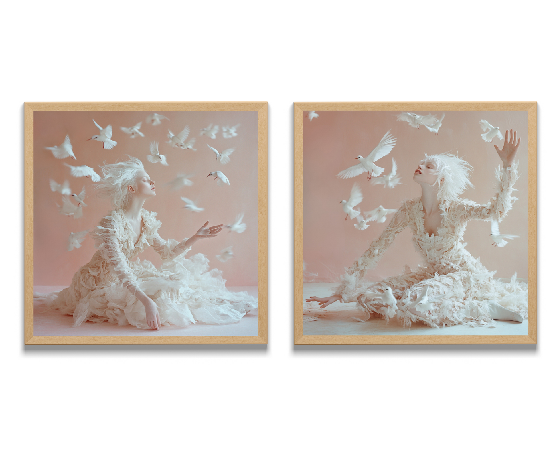 Accede a estas dos piezas de la serie Alma Libre, que se venden por separado. Dos figuras femeninas en atmósferas íntimas, rodeadas de palomas que las envuelven como pensamientos alados. Cada escena revela una expresión de libertad más profunda: la del alma que ha elegido su propio ritmo. Un homenaje visual a la introspección y la belleza interior.