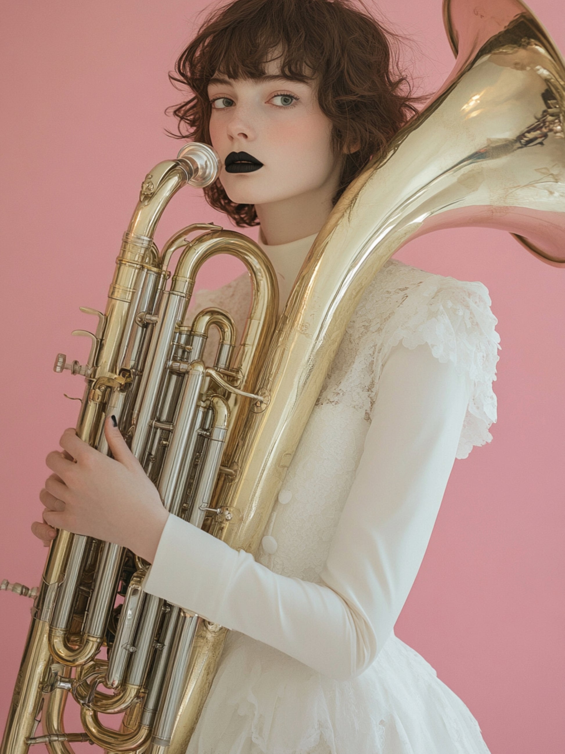 Lámina decorativa con la ilustración de una figura femenina enigmática de labios negros, vestida de blanco y sosteniendo un trombón.