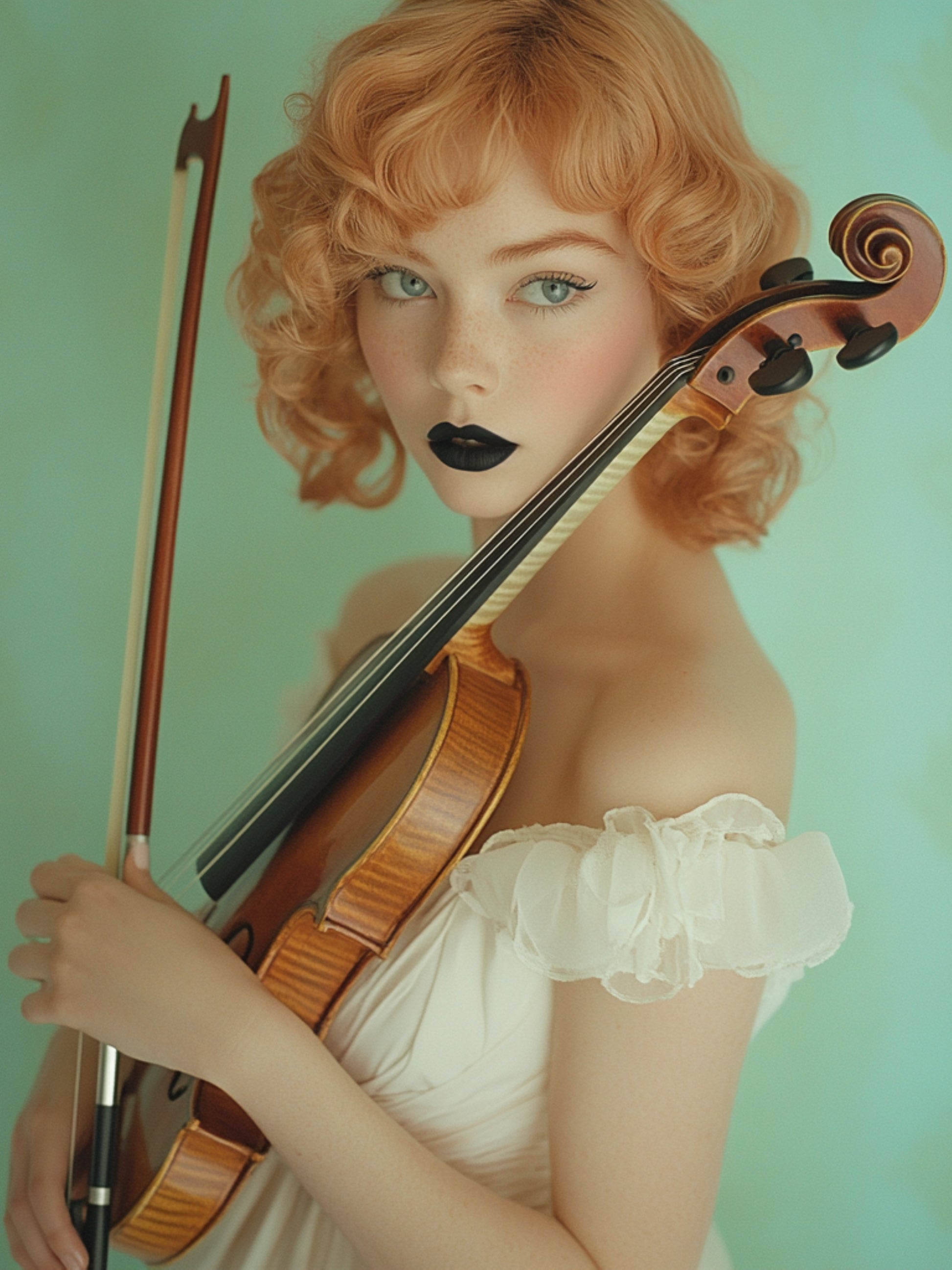 Ilustración decorativa de una mujer de labios negros y presencia enigmática, vestida de blanco y con un violín entre las manos.