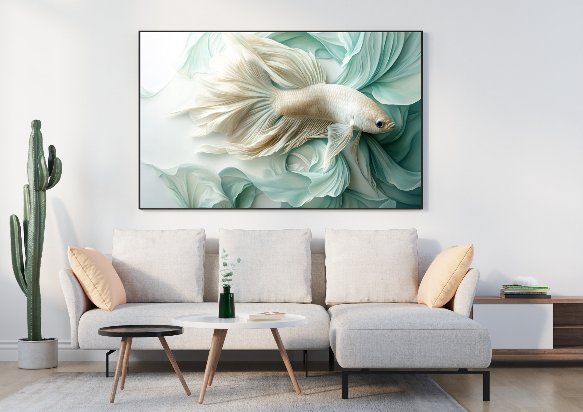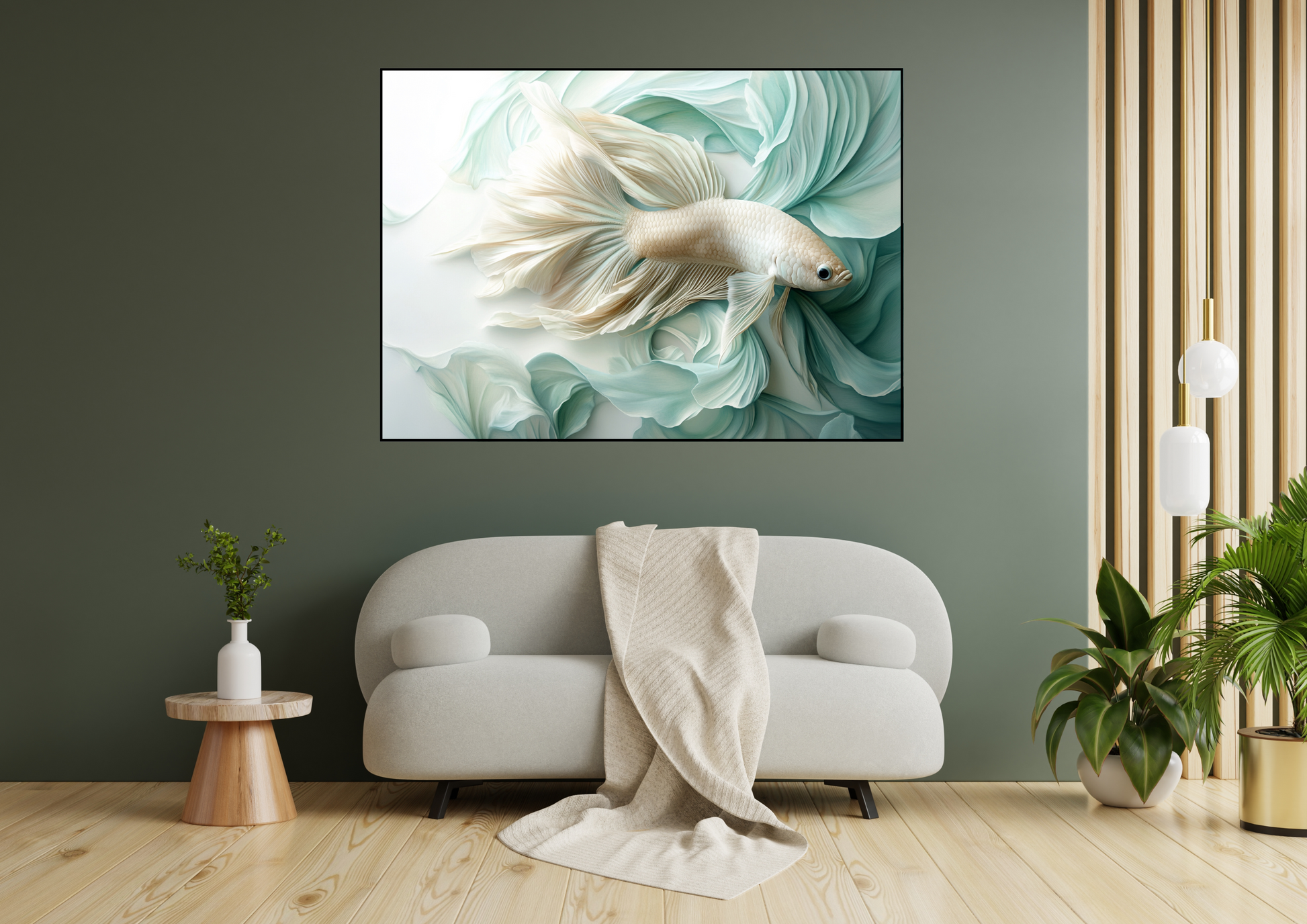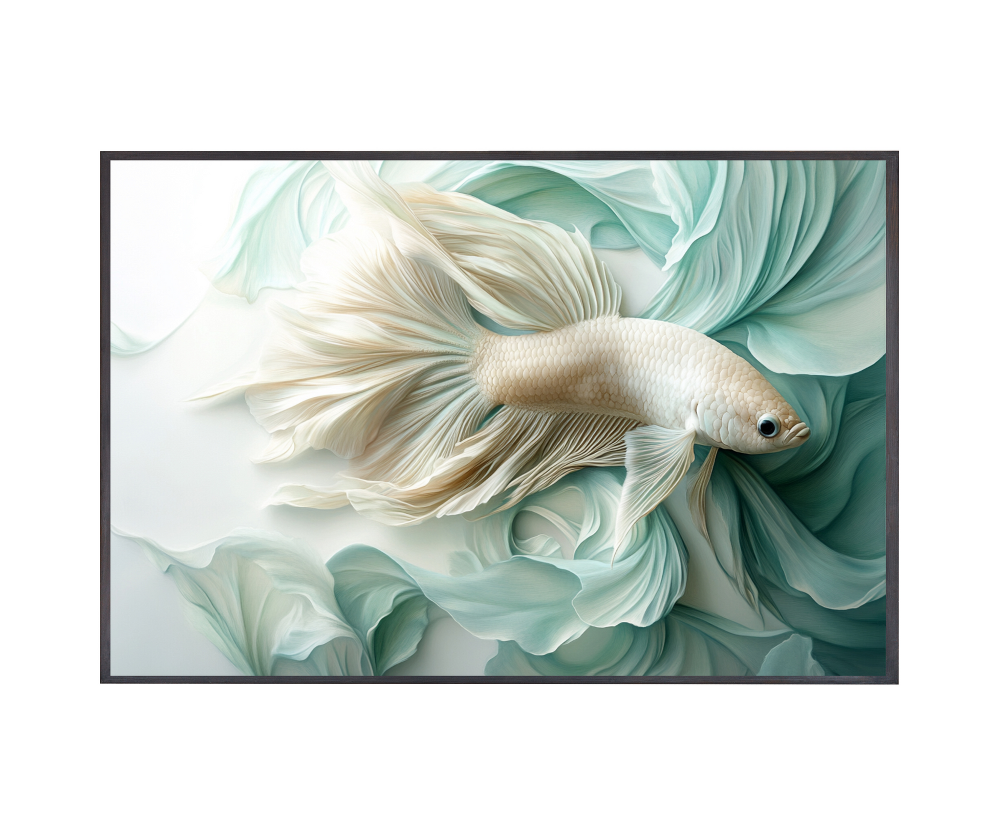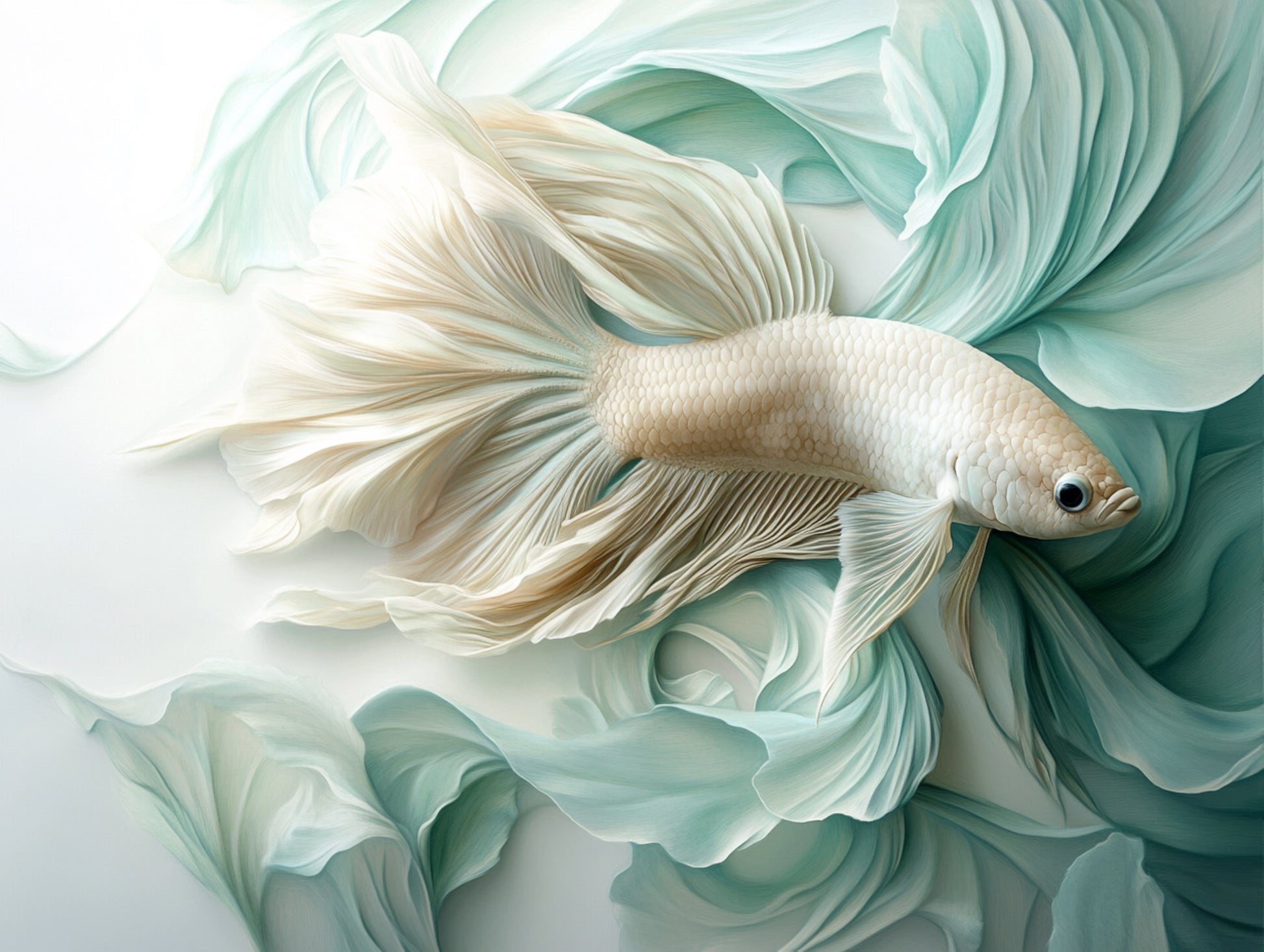 Lámina de una delicada figura de pez beige, que se desliza suavemente en un entorno de ensoñación teñido de verdes profundos, creando una atmósfera de calma y misterio.