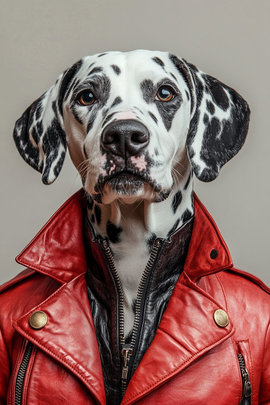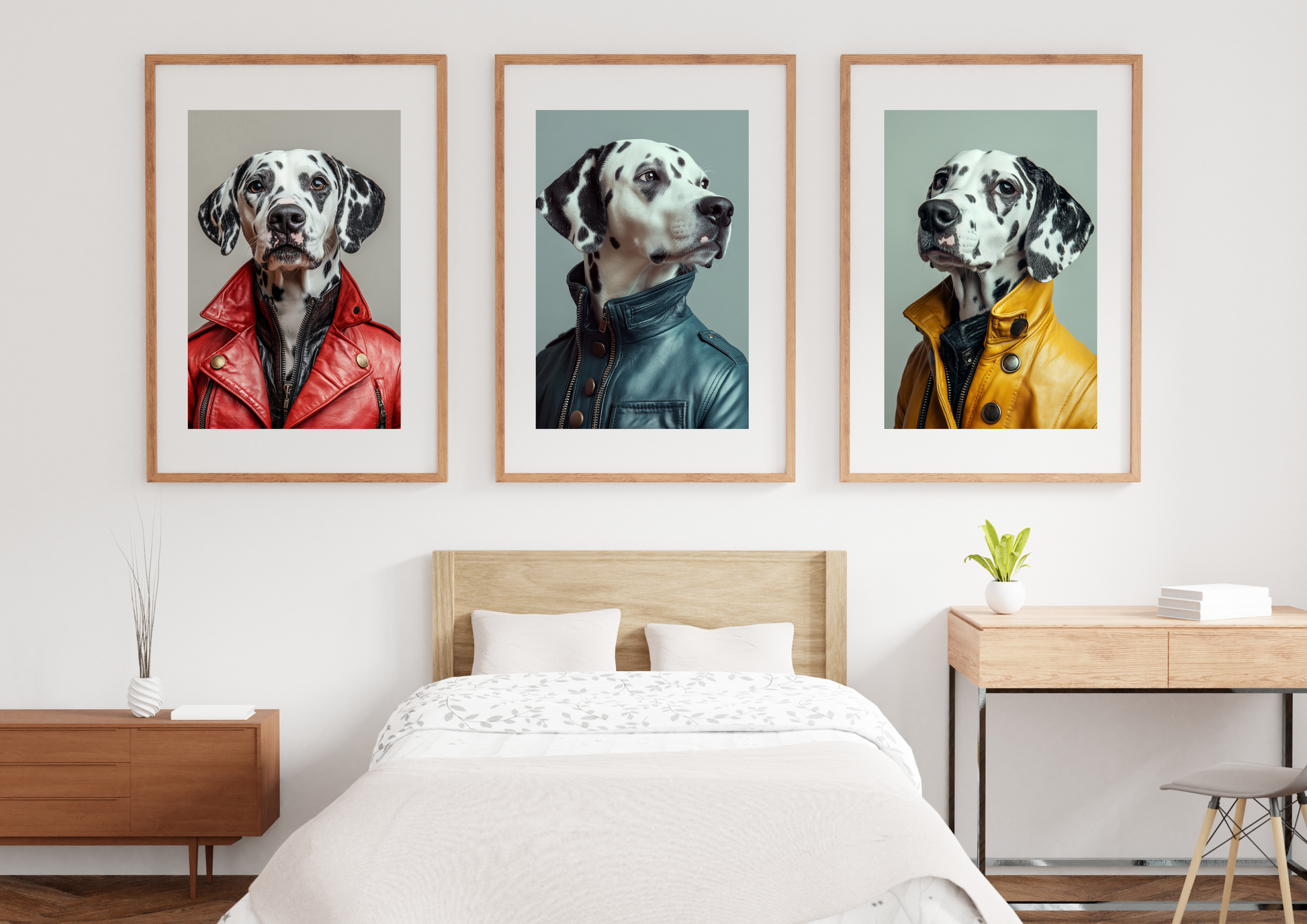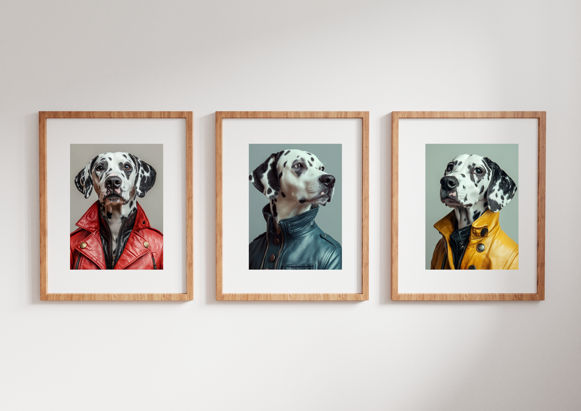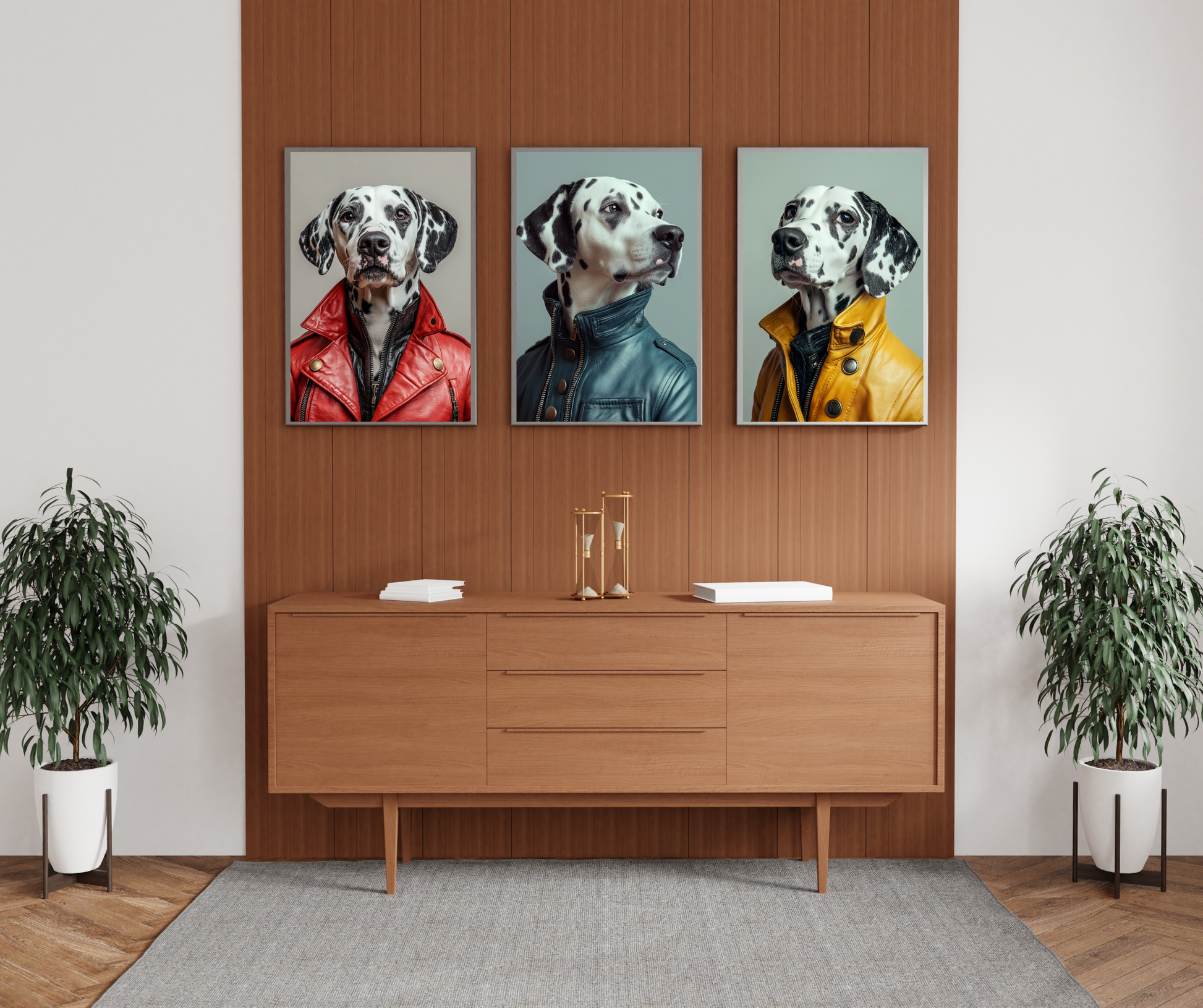 Láminas decorativa con una ilustración original de un perro vestido con chaqueta de cuero. Una combinación audaz colmada de estilo y humor.