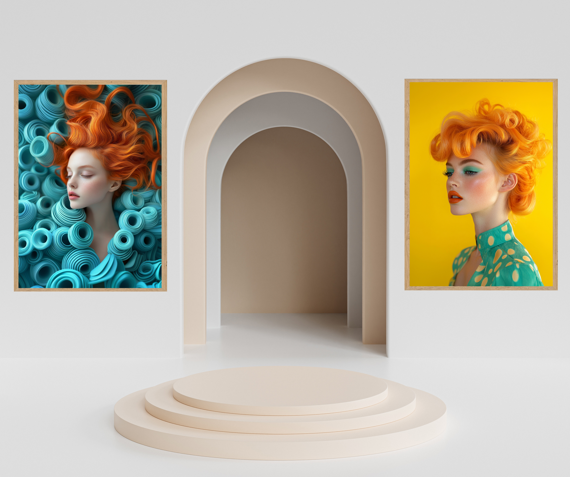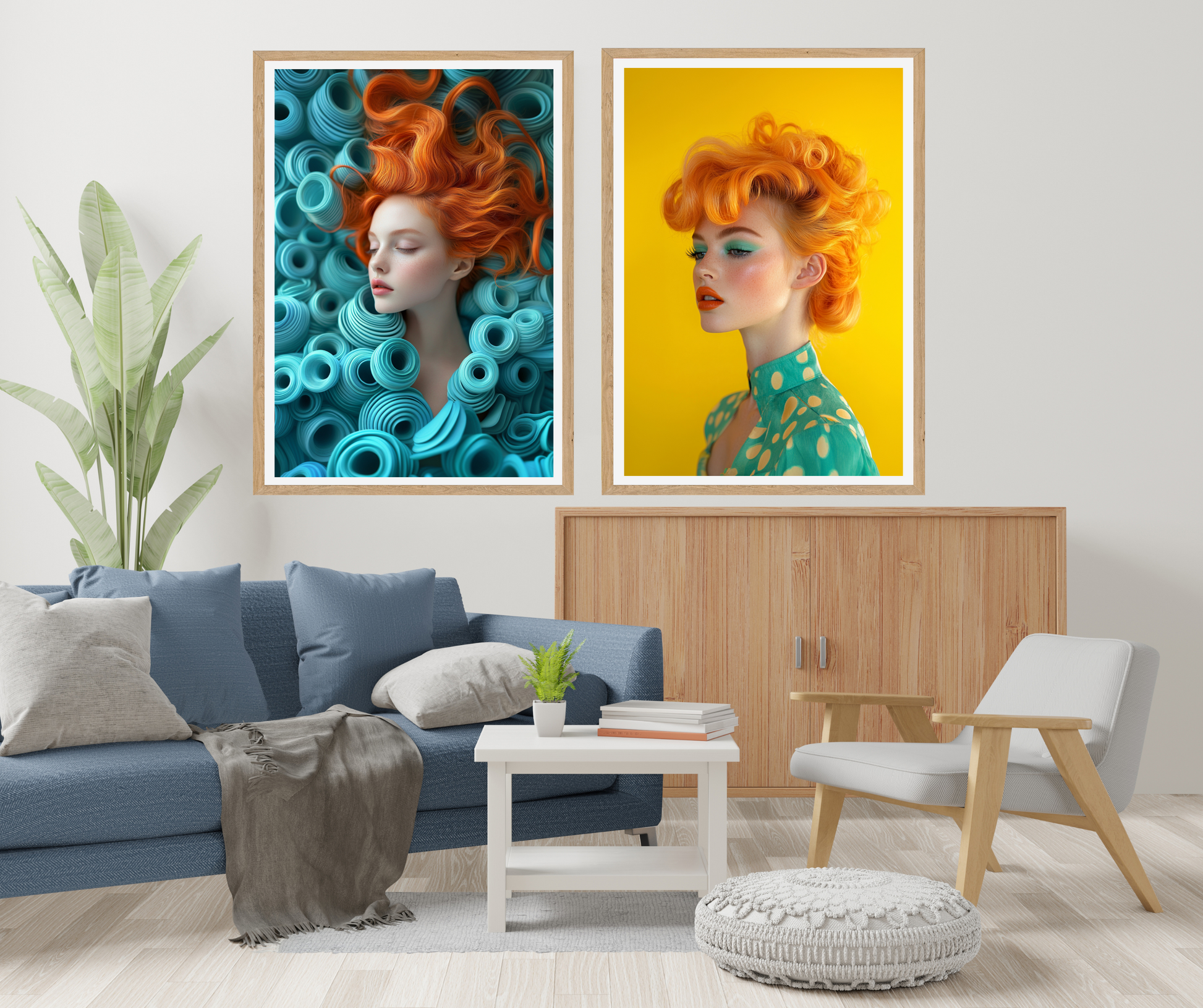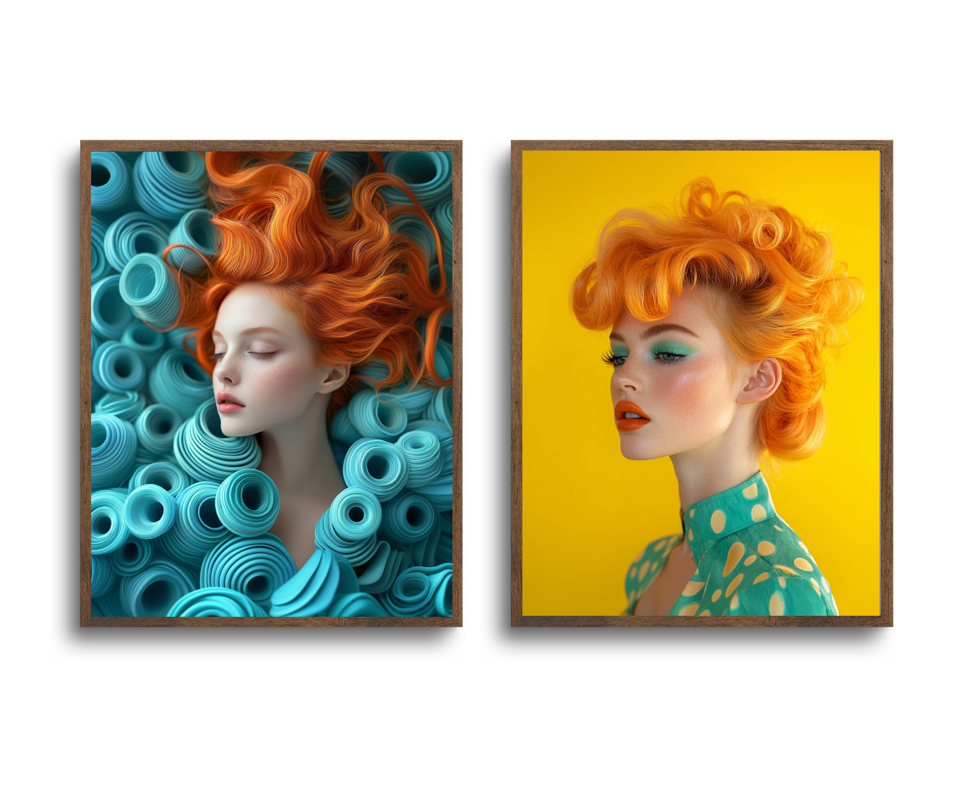 Conjunto de dos láminas decorativas, que puedes comprar juntas o por separado, con retratos únicos de mujeres pelirrojas, que exploran contrastes visuales y atmósferas distintivas.