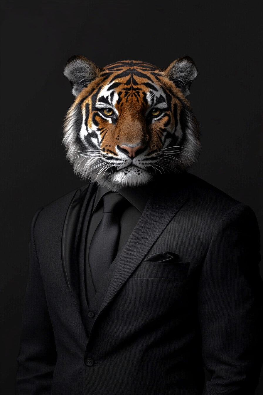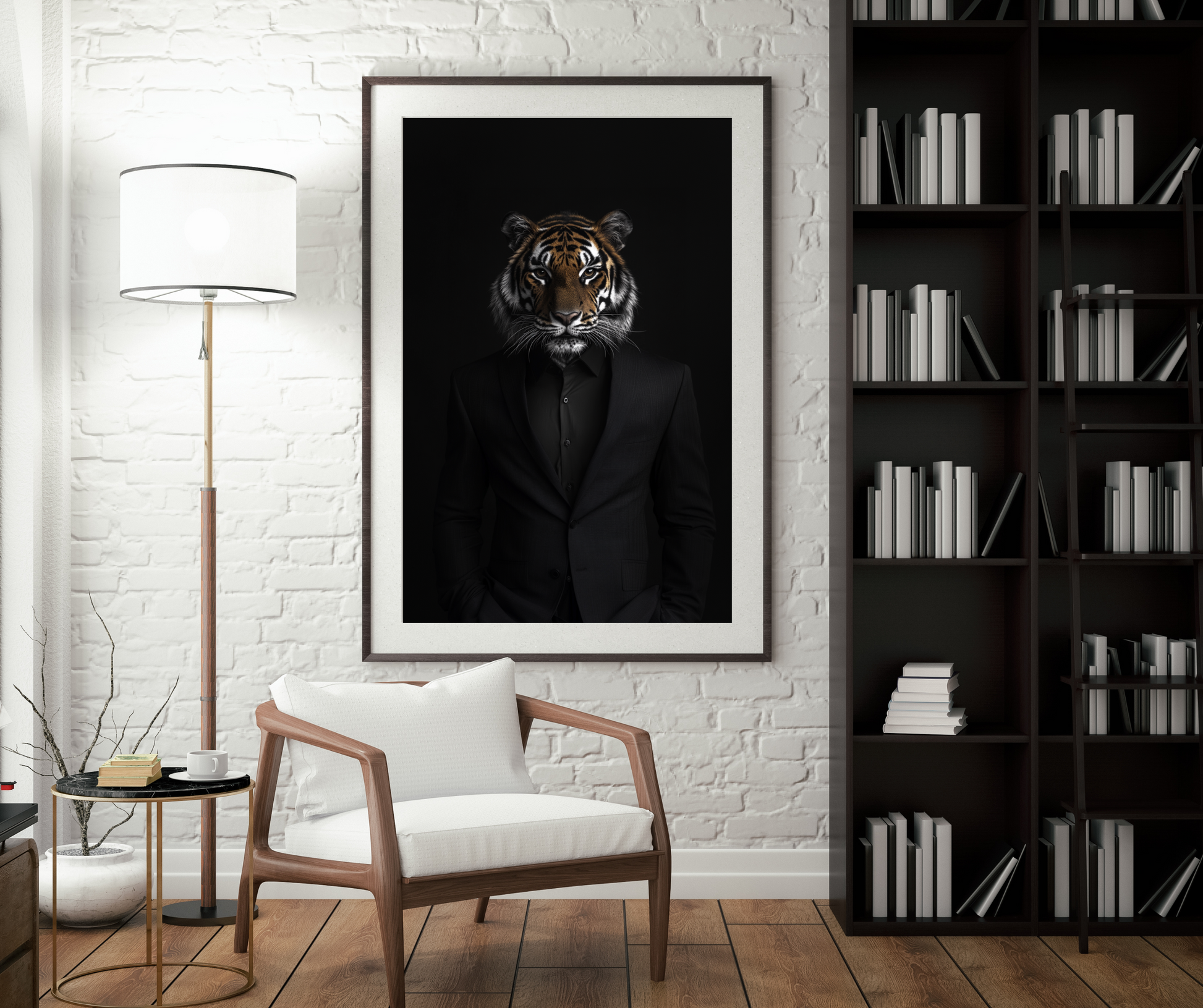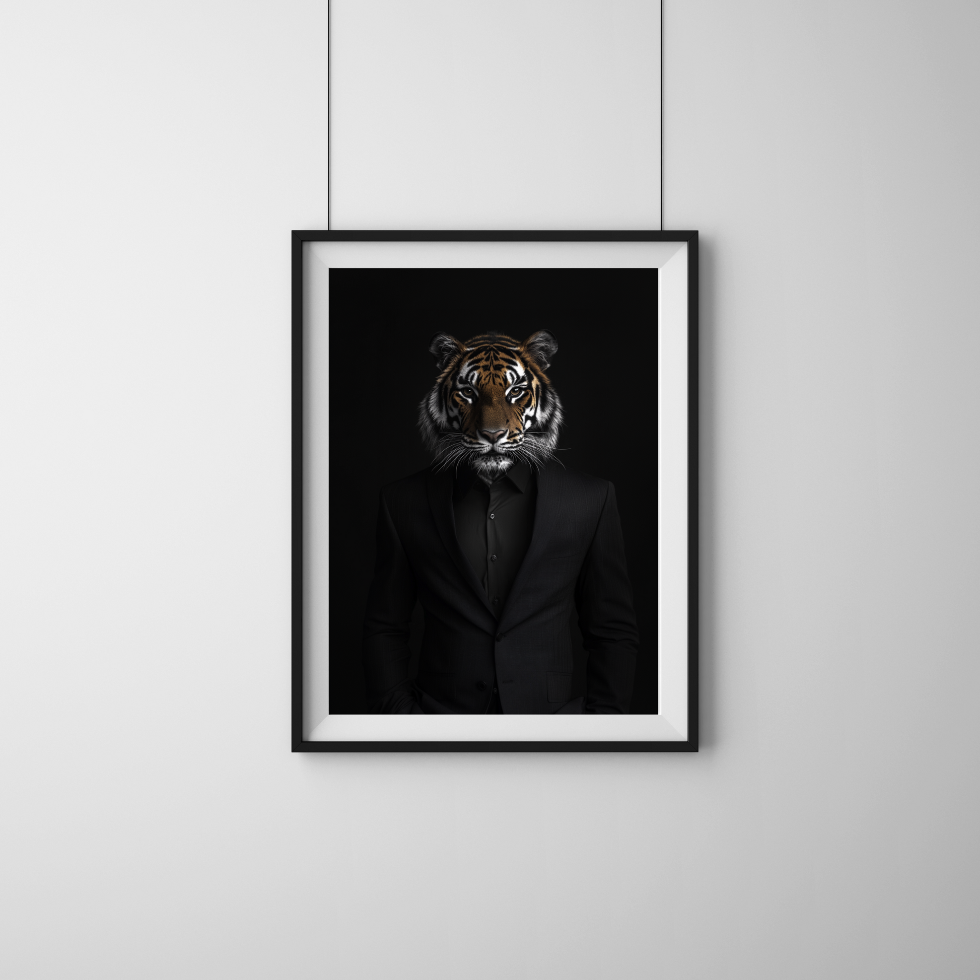 Lámina decorativa con la ilustración de un elegante tigre, vestido con un impecable traje negro.