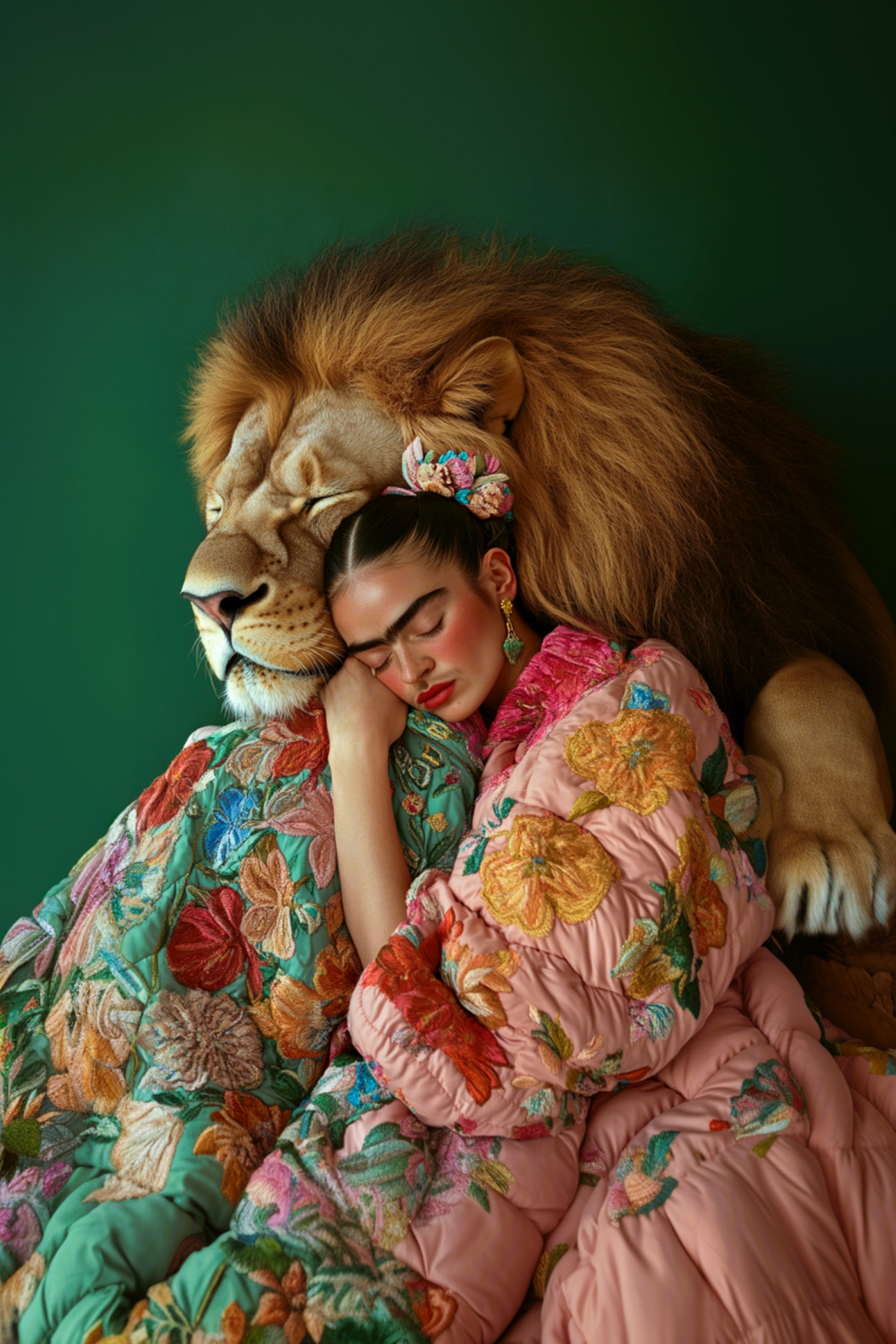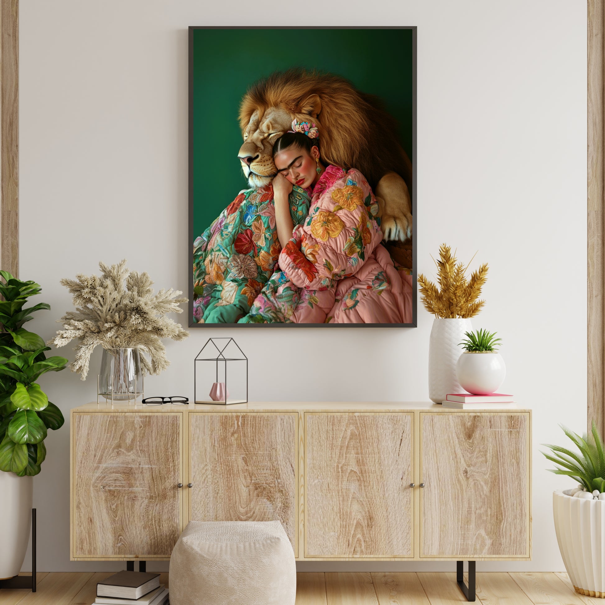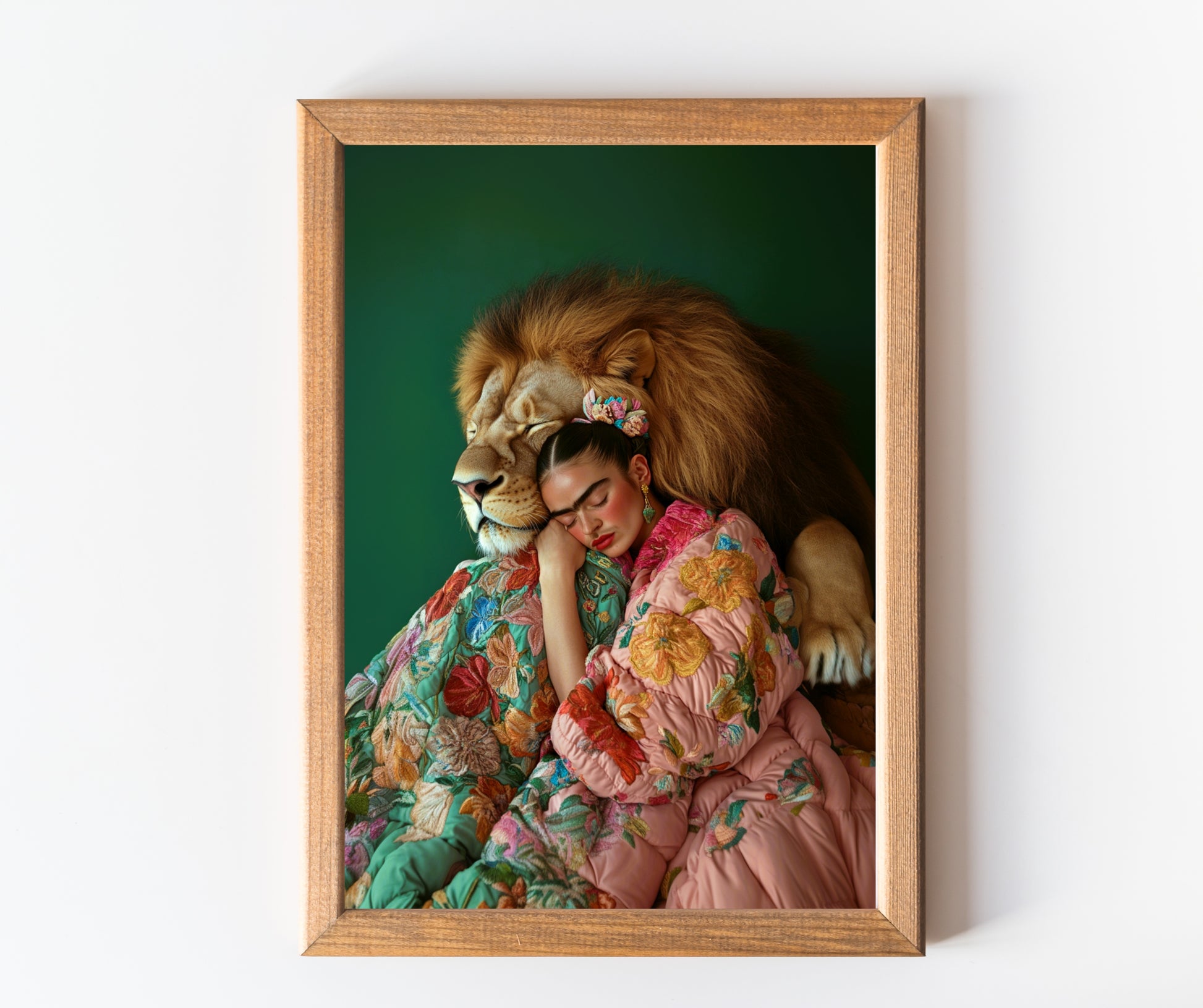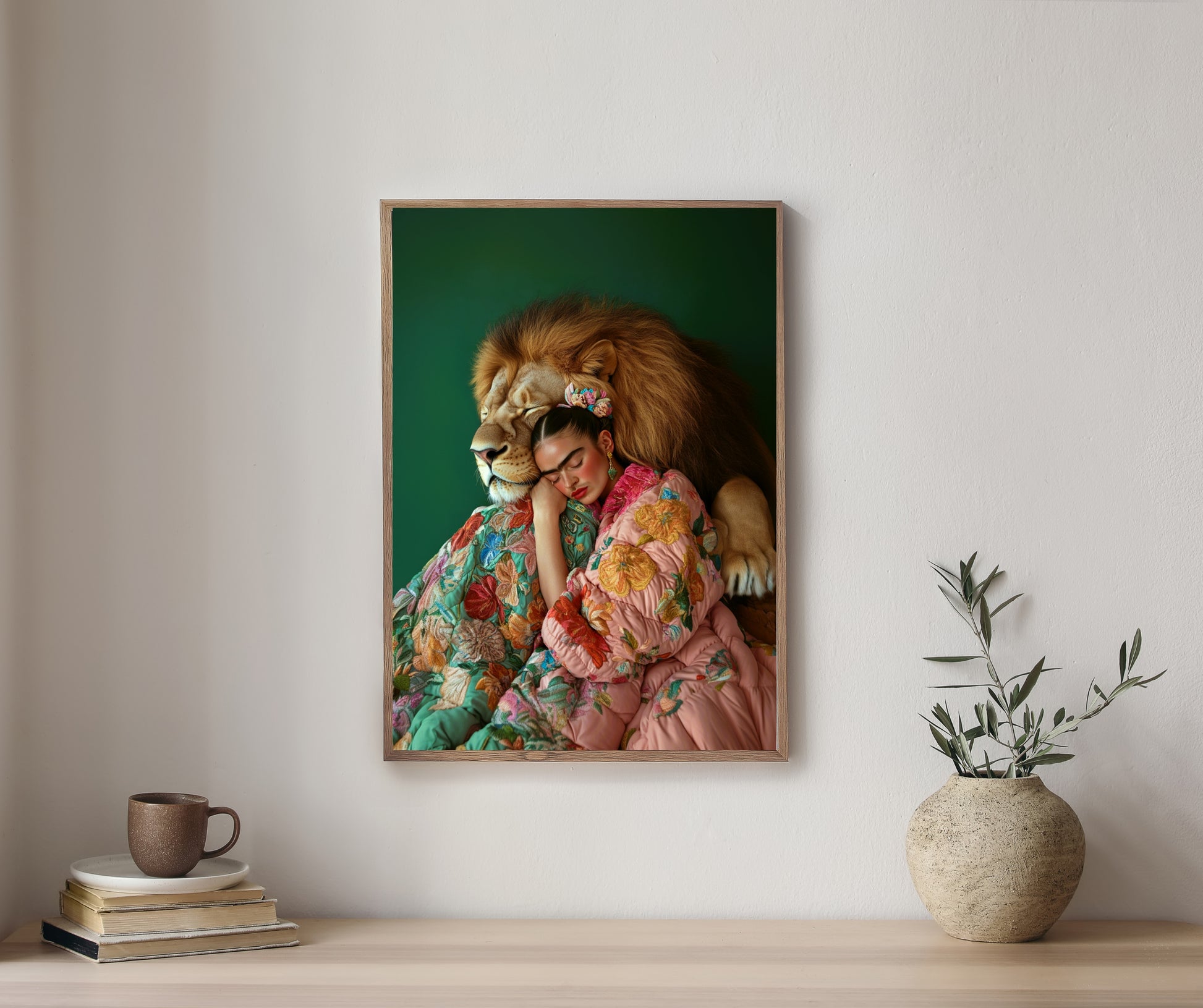 Lámina que retrata a Frida Kahlo en un gesto íntimo y poderoso, abrazando a un león con ternura serena.