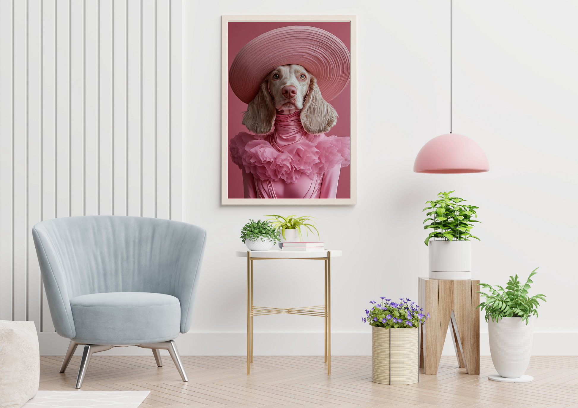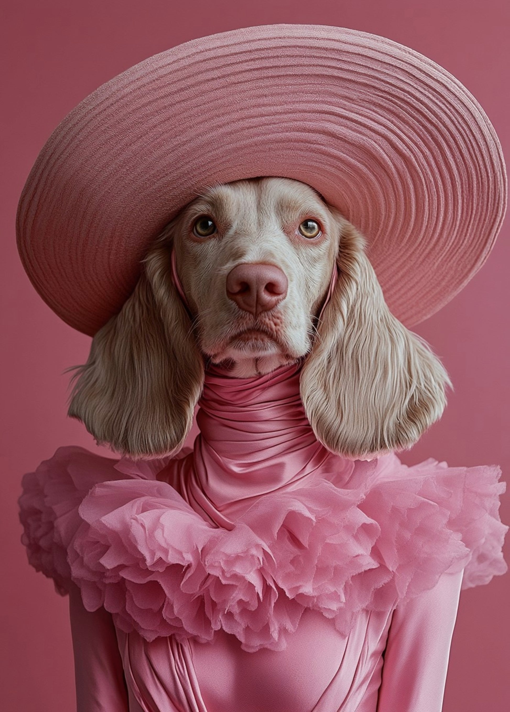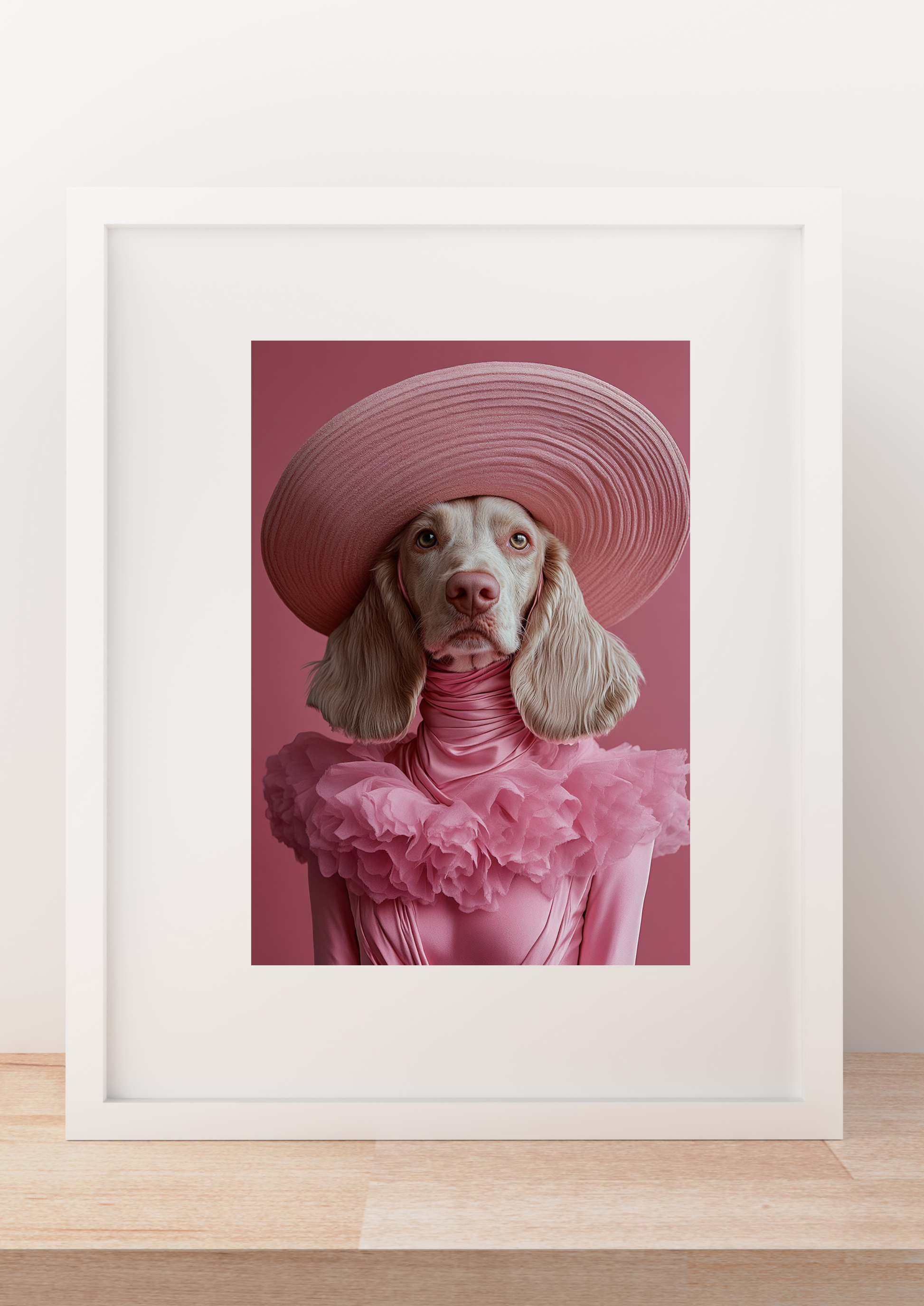 Lámina con una composición llena de estilo, de una cocker con sombrero y vestido rosa, pura distinción canina.