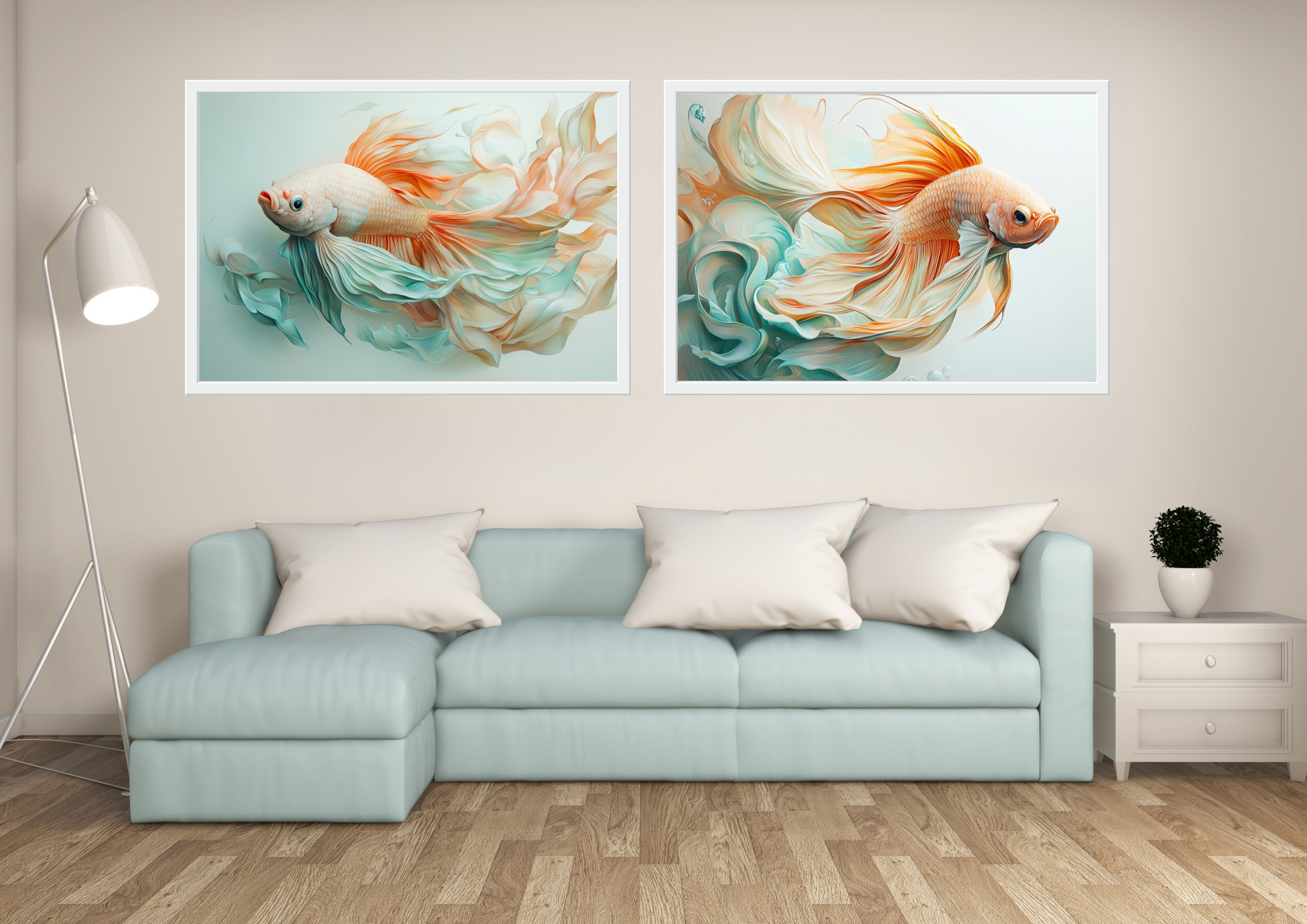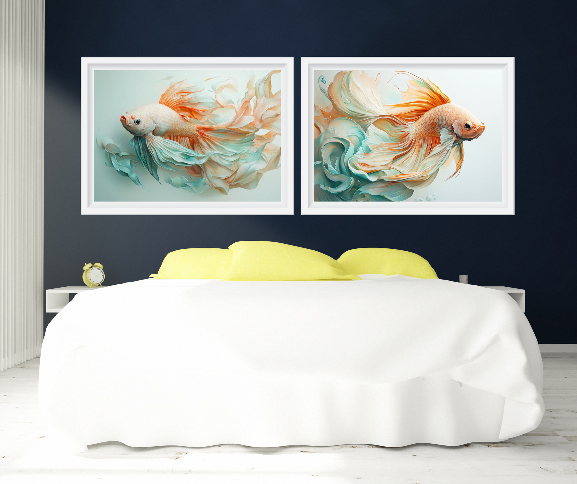 Láminas que capturan el movimiento fluido de un gran pez naranja en su entorno cálido y etéreo. Pueden adquirirse juntas o por separado.