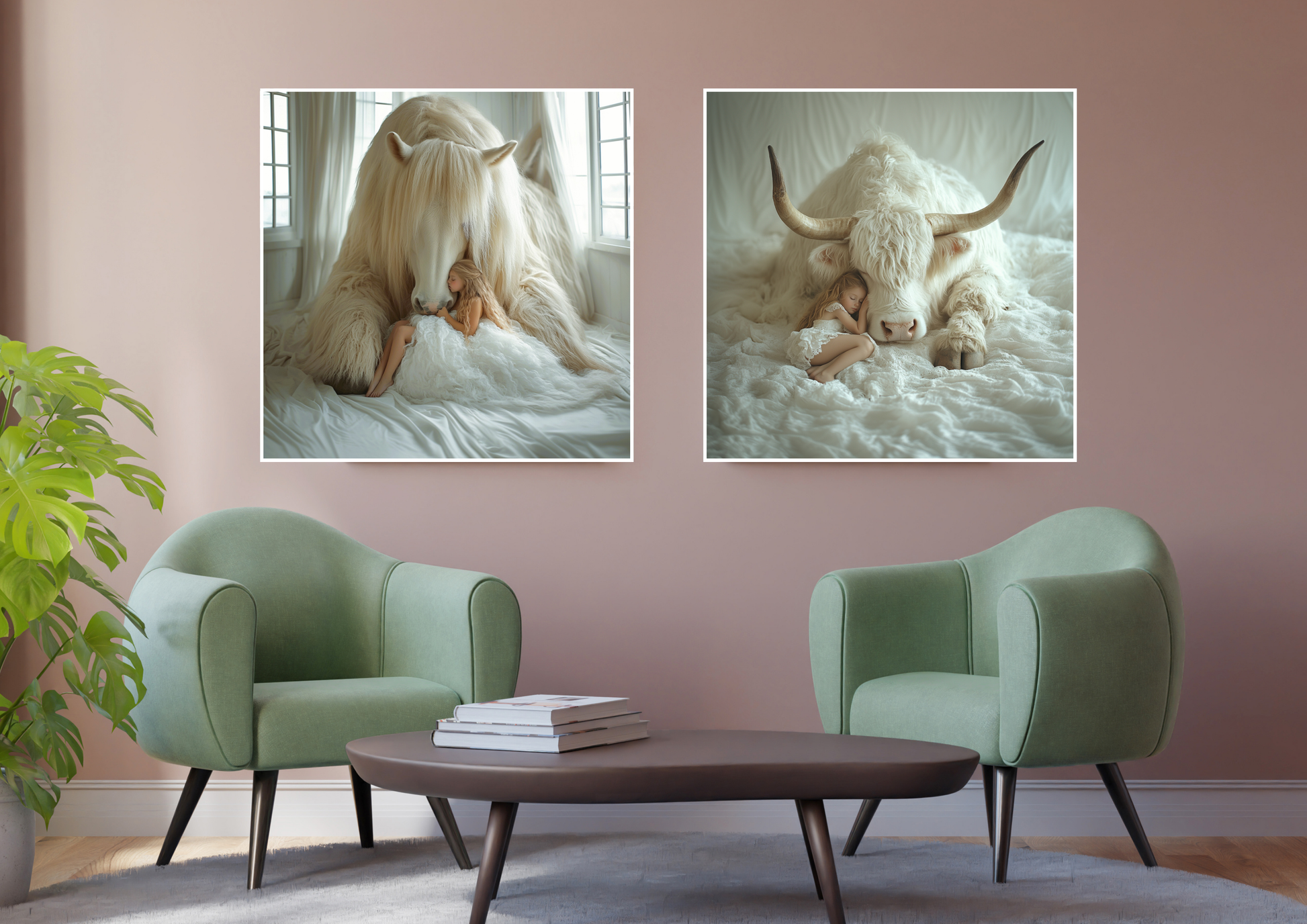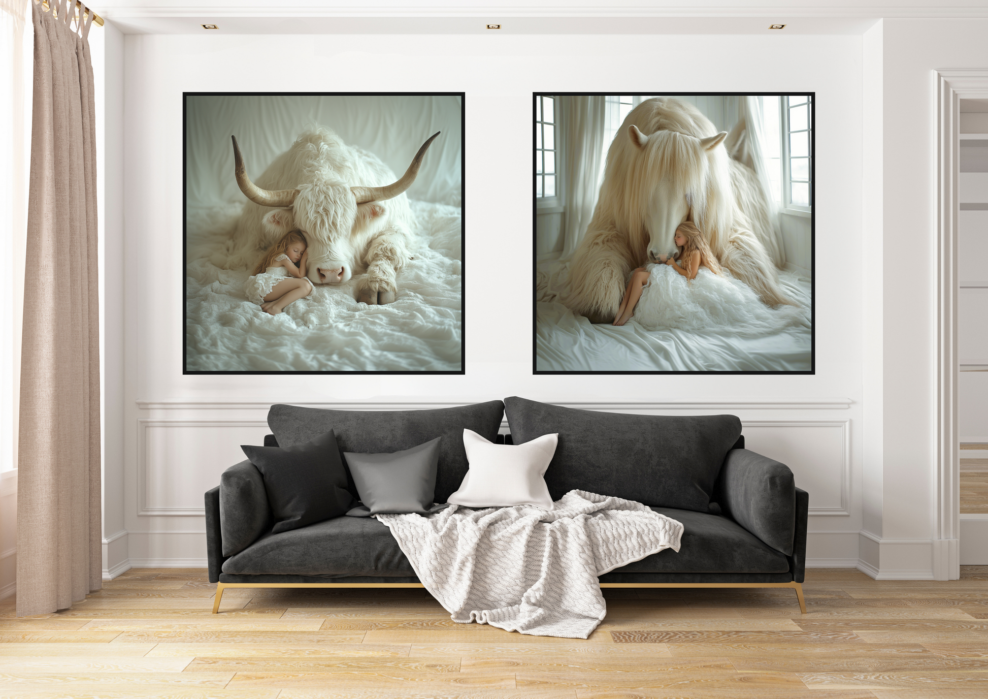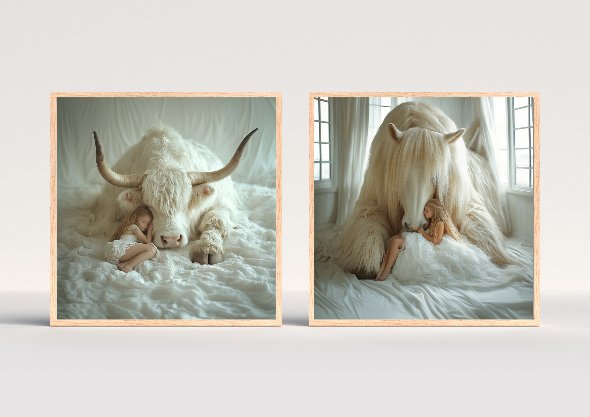 Accede a estas dos piezas de la serie Sueño Blanco y escoge tu favorita. En cada una, una niña descansa plácidamente bajo la silenciosa protección de un animal inmenso: un búfalo y un caballo, figuras de fuerza y calma.
