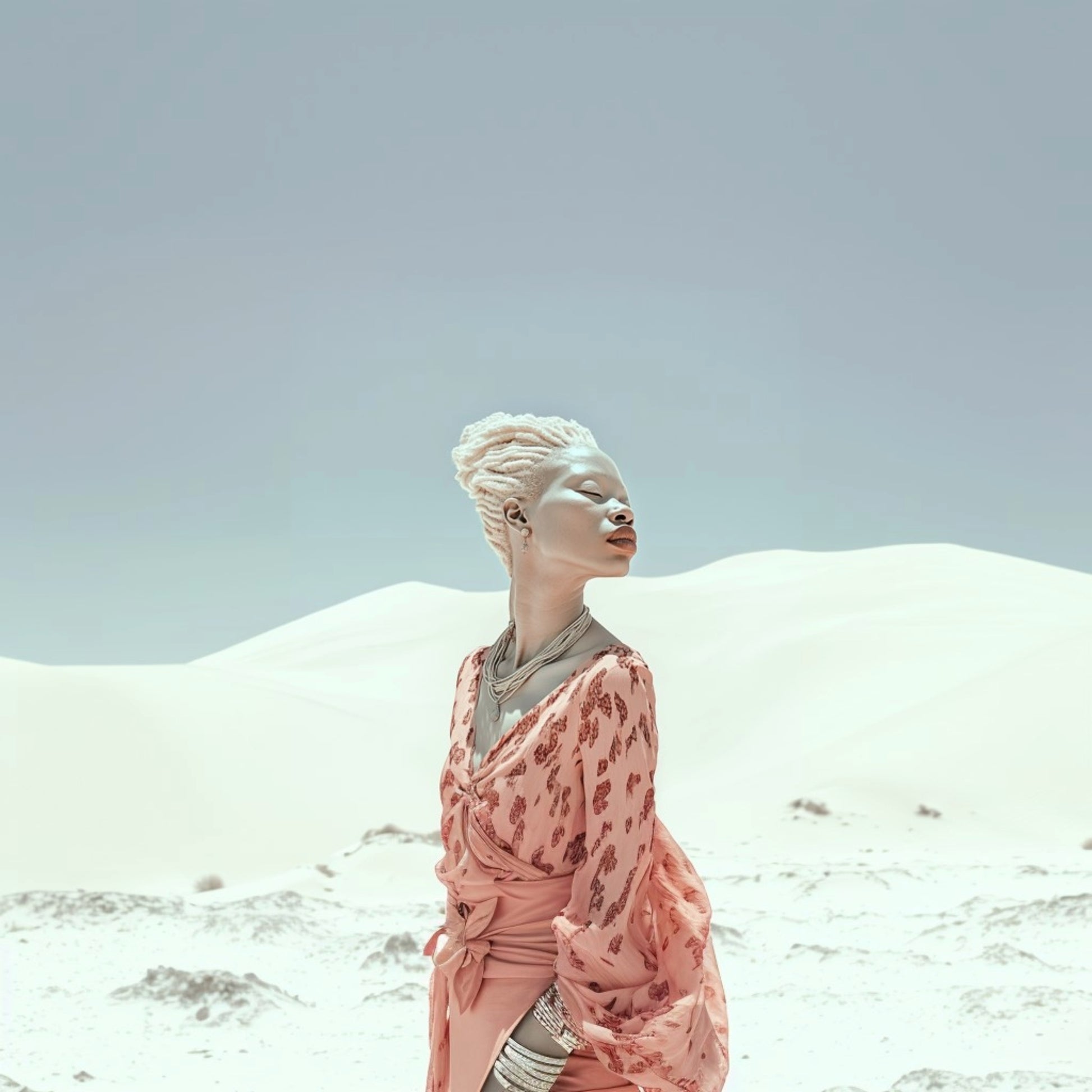 Ilustración que retrata a una mujer africana albina enmarcada en un paisaje desértico de atmósfera onírica.